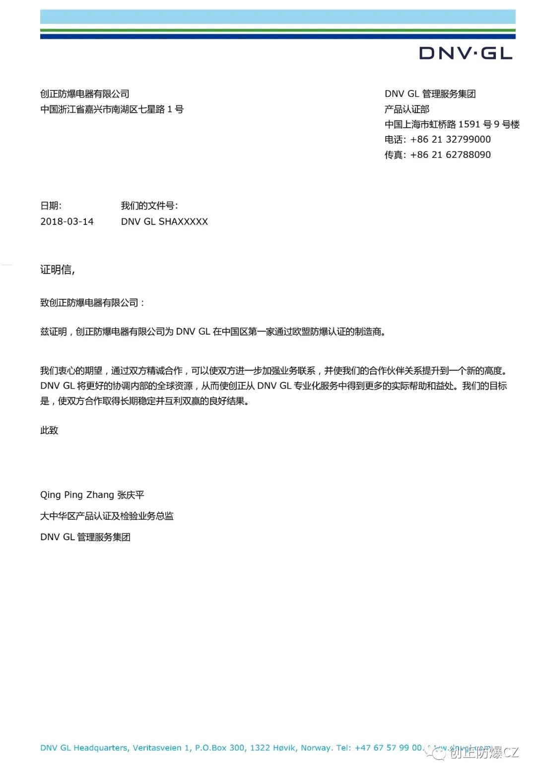 (DNV为创正颁发的官方证明:创正是DNV在中国第一家签发欧盟ATEX产品证书的防爆制造企业)