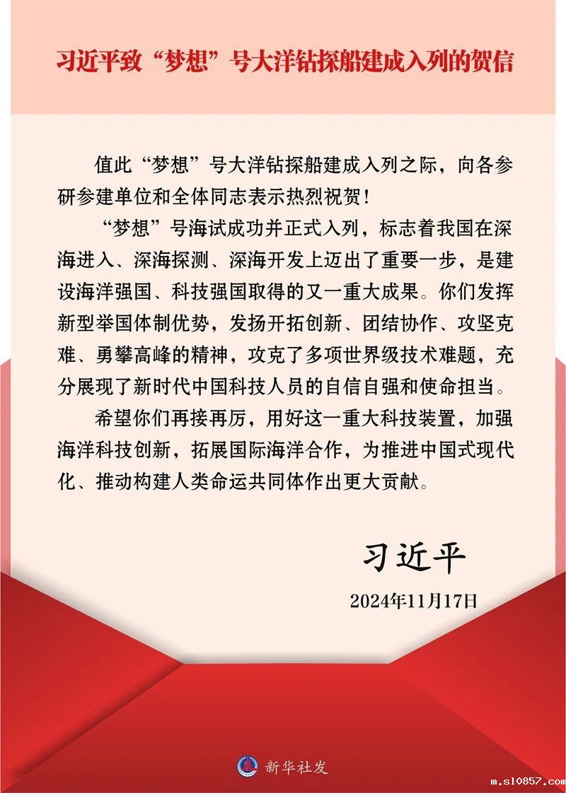 我国自主设计建造的首艘大洋钻探船“梦想”号11月17日在广州正式入列。中共中央总书记、国家主席、中央军委主席习近平发来贺信,表示热烈祝贺。习近平在贺信中指出,“梦想”号海试成功并正式入列,标志着我国在深海进入、深海探测、深海开发上迈出了重要一步,是建设海洋强国、科技强国取得的又一重大成果。