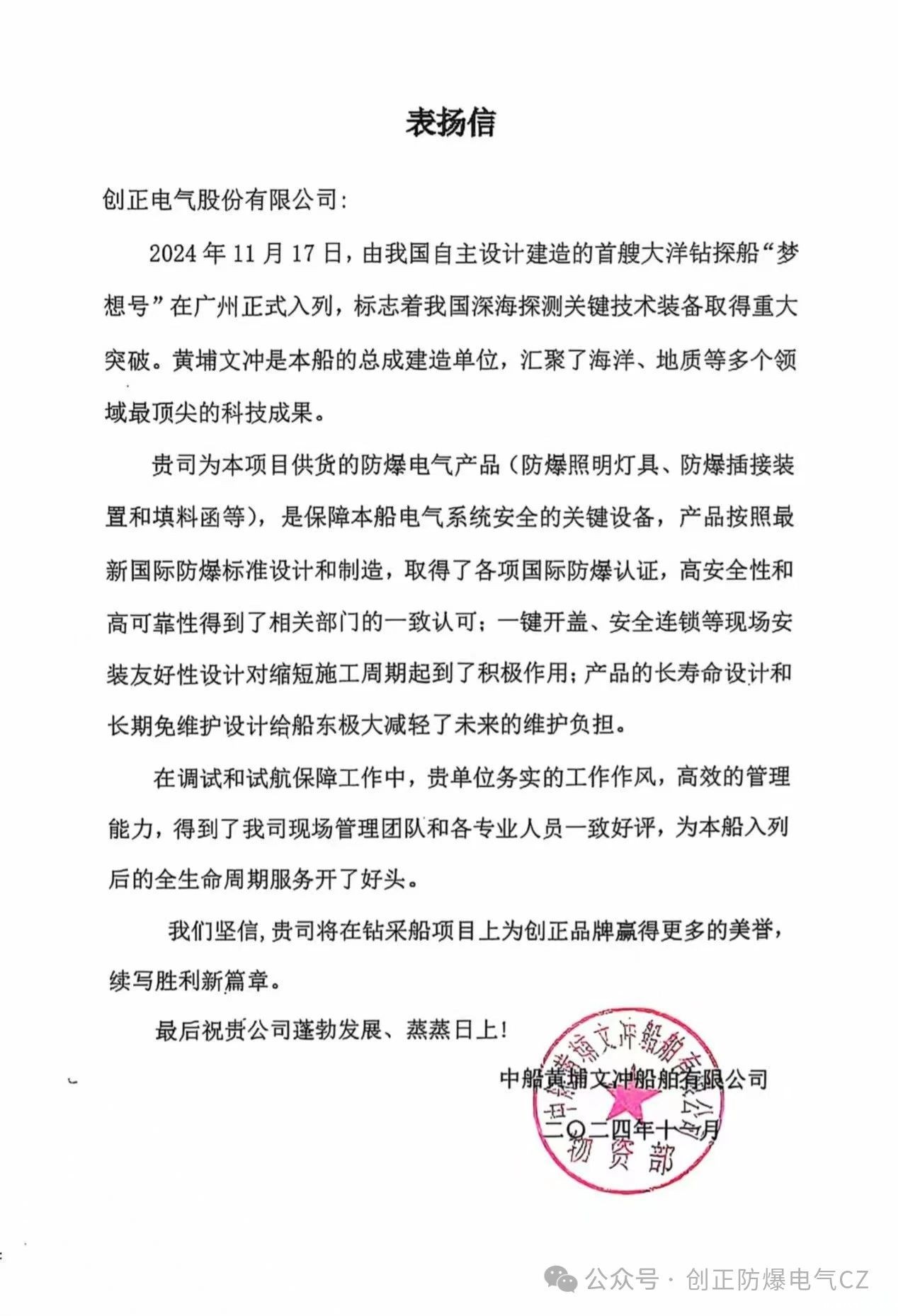 梦想”号海试成功并正式入列,中船黄埔文冲船舶有限公司物资部向我司发来感谢信,在“梦想”号建设过程中,对米兰app下载安装提供的高安全性和高可靠性的防爆电气产品以及专业高效服务能力表示好评。