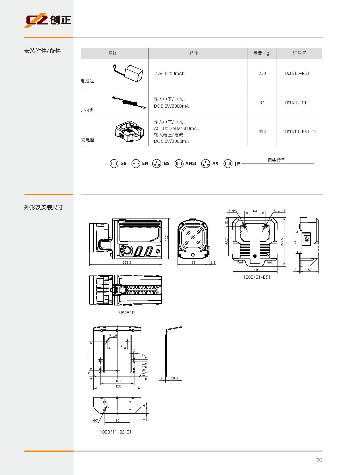 | 充电方式 | 配合1000/10-B51专用充电座充电 |